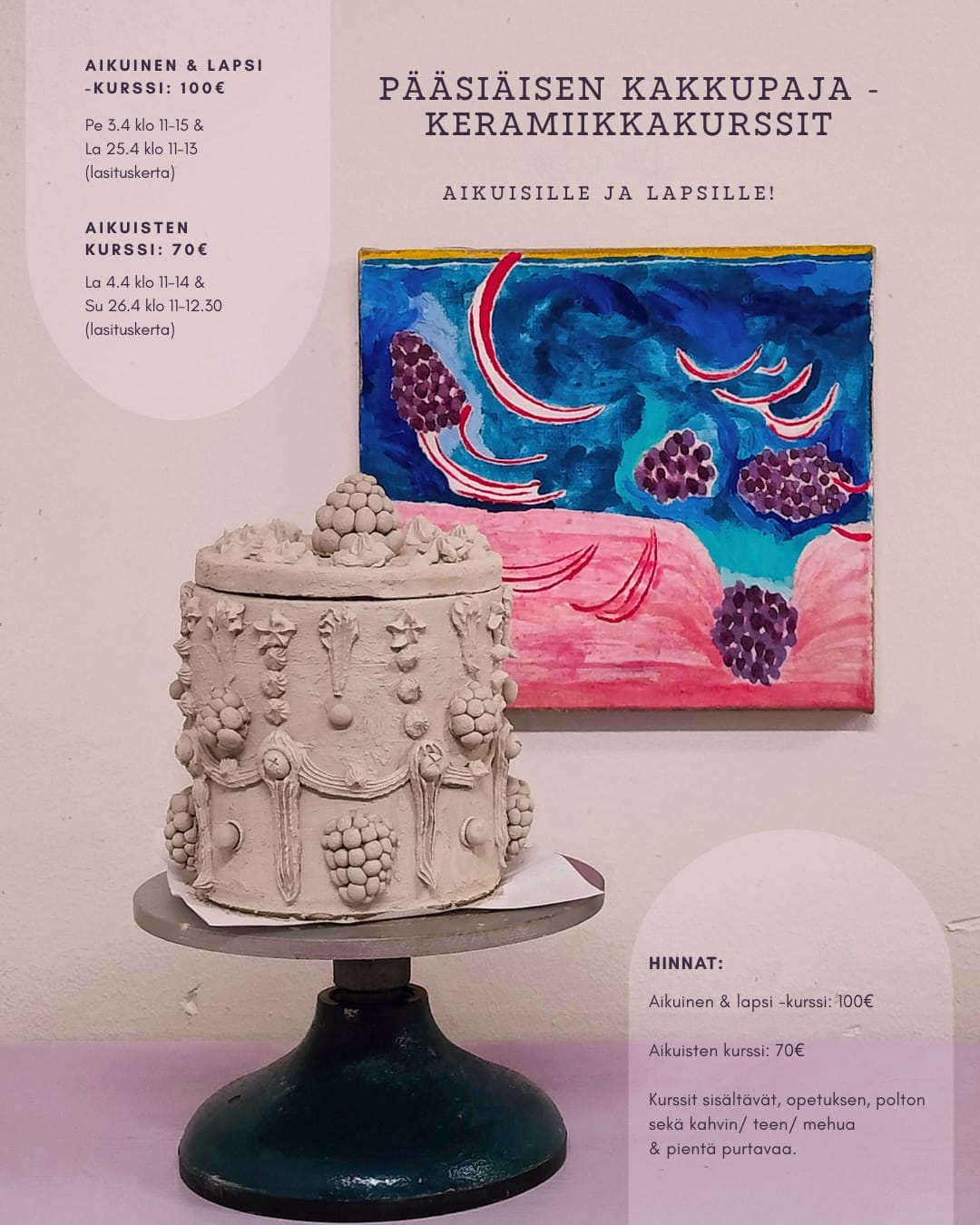 Kursseillamme voit kehittää taitojasi oman taitotasosi ja mieltymystesi mukaan. Keramiikka- ja kuvataideopettajillamme on vahva taidekoulutustausta, jota he hyödyntävät opetuksessaan. Heillä on myös monipuolisesti kokemusta lasten ja nuorten taidekasvatuksesta.